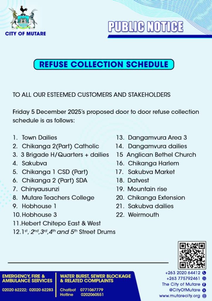 December 4, 2025 - In Daily Notices By Charles Sadondo Comment off Refuse schedule 5 December 2025 Previous Refuse schedule 4 December 2025