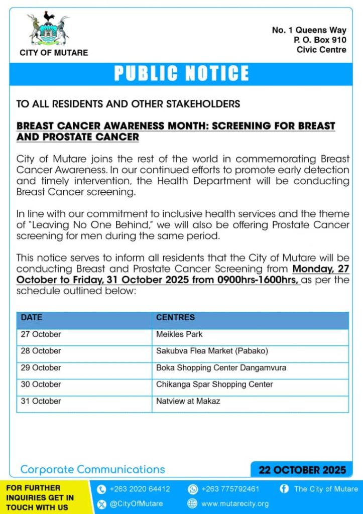 October 28, 2025 - In Daily Notices By Charles Sadondo Comment off BREAST CANCER AND PROSTATE CANCER SCREENING Previous WASTE CHARACTERISATION DATA COLLECTION 29 SEPTEMBER TO 12 NOVEMBER 2025 Next 2026 BUDGET DATA COLLECTION EXERCISE