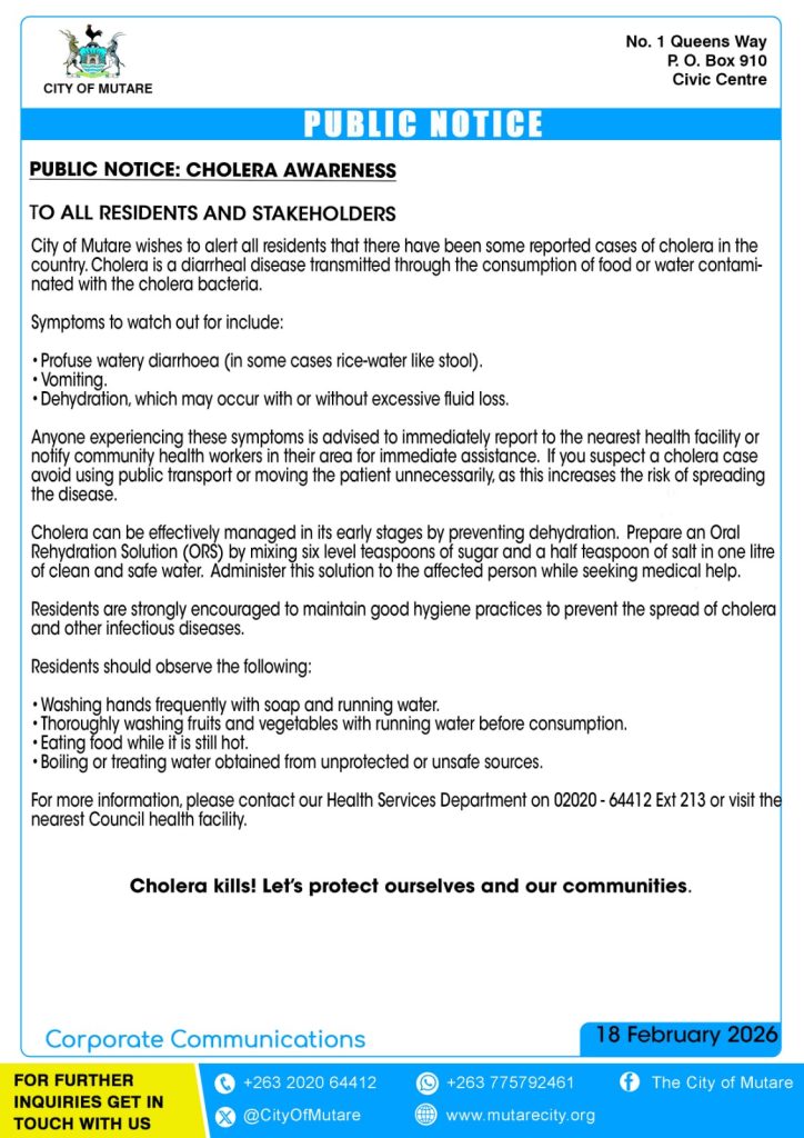 February 18, 2026 - In Daily Notices By Charles Sadondo Comment off Cholera Awareness February 2026 Previous Water update 18 February 2026