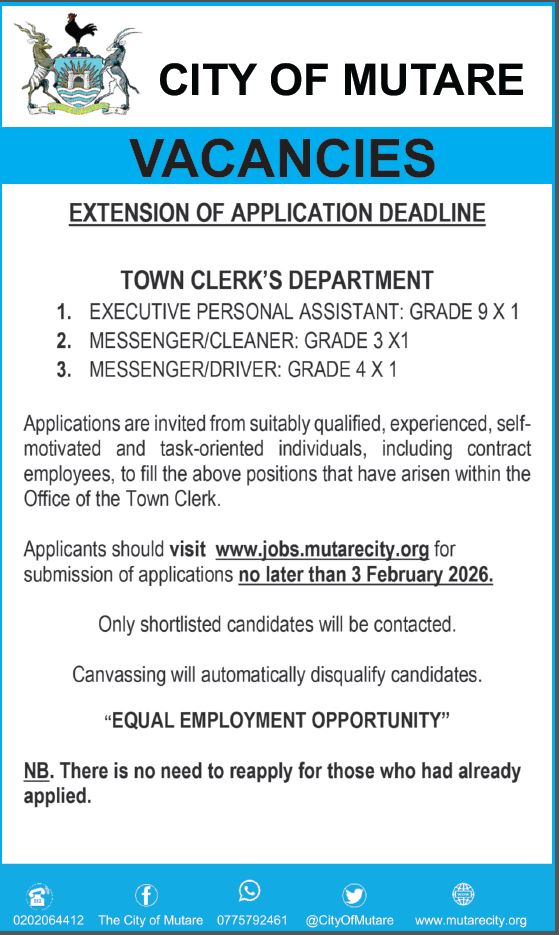 CITY OF MUTARE......VACANCIES TOWN CLERK'S OFFICE 14 JANUARY 2026