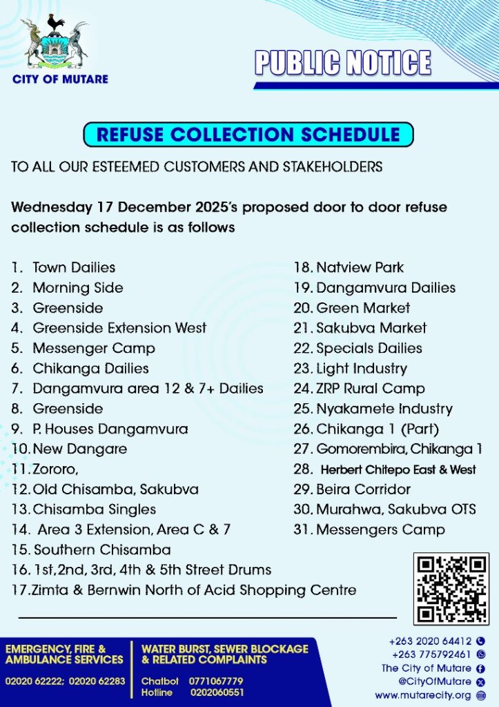 December 17, 2025 - In Daily Notices By Charles Sadondo Comment off Refuse schedule 17 December 2025 Previous Water update 17 December 2025