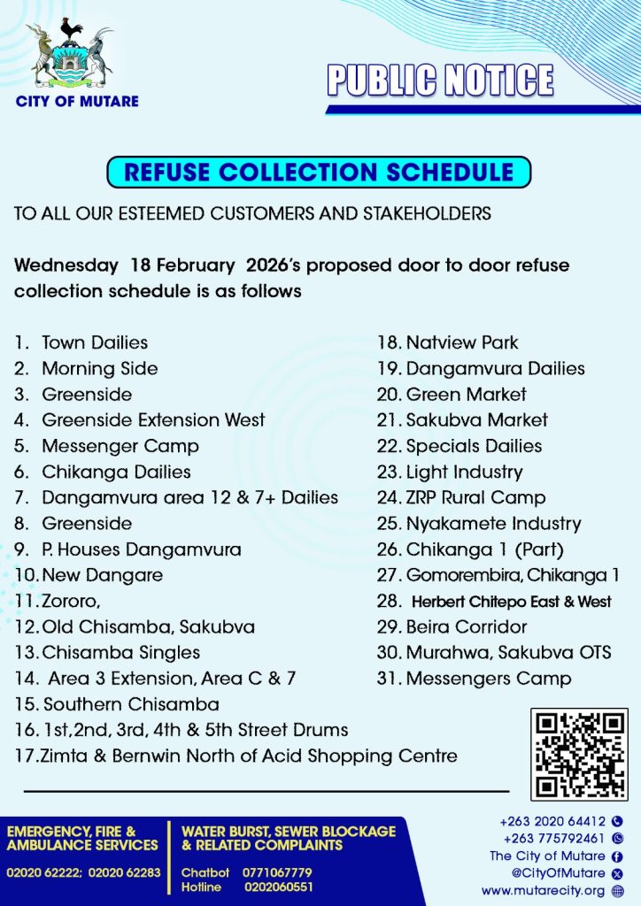 February 18, 2026 - In Daily Notices By Charles Sadondo Comment off Refuse schedule 18 February 2026 Previous Refuse schedule 13 February 2026 Next Water update 18 February 2026