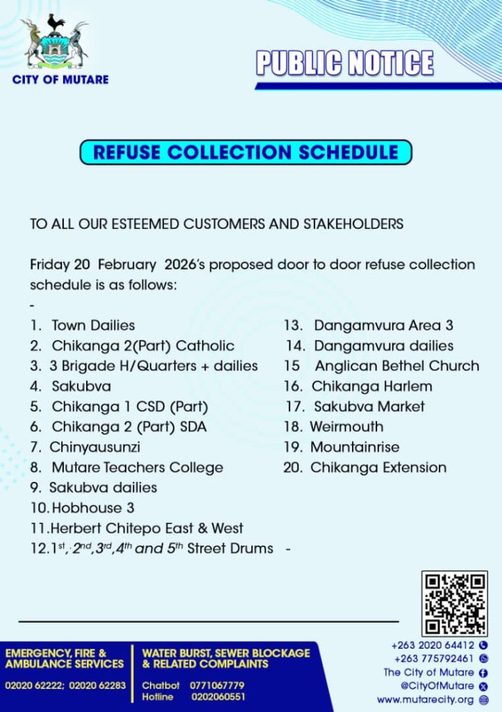 February 20, 2026 - In Daily Notices By Charles Sadondo Comment off Refuse schedule 20 February 2026 Previous Cholera Awareness February 2026 Next Water update 20 February 2026