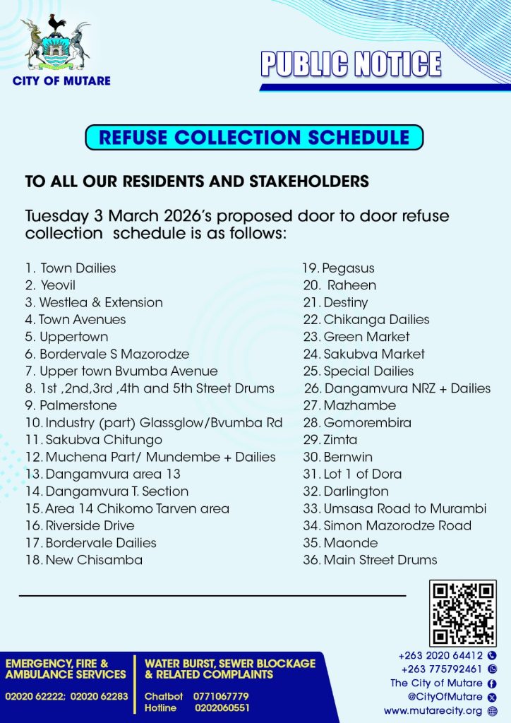 March 2, 2026 - In Daily Notices By Charles Sadondo Comment off Refuse schedule 3 March 2026 Previous Water update 2 March 2026
