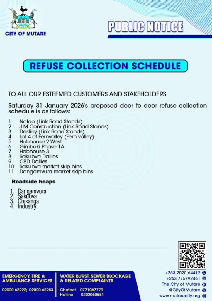 January 30, 2026 - In Daily Notices By Charles Sadondo Comment off Refuse schedule 31 January 2026 Previous Refuse schedule 30 January 2026 Next Fire safety requirements and display on emergency numbers 30 January 2026