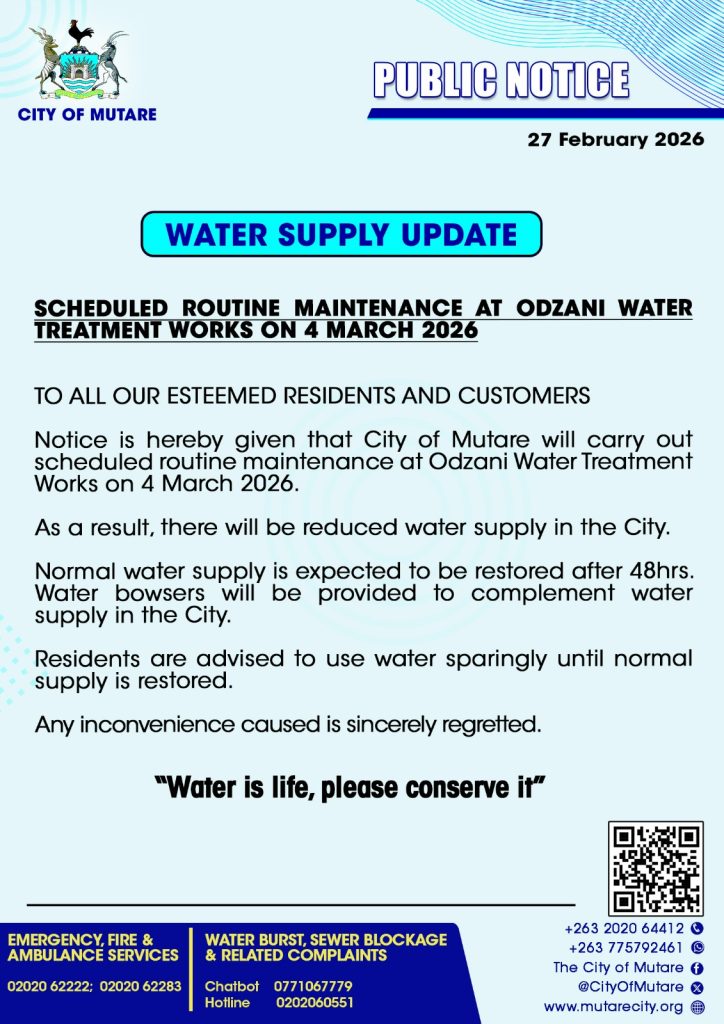 February 27, 2026 - In Daily Notices By Charles Sadondo Comment off Scheduled routine maintenance at Odzani Water Works Previous Water update 27 February 2026