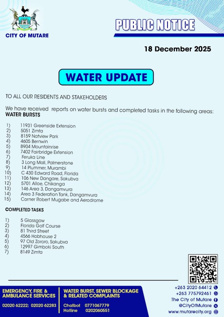 December 18, 2025 - In Daily Notices By Charles Sadondo Comment off Water update 18 December 2025 Previous Refuse schedule 17 December 2025