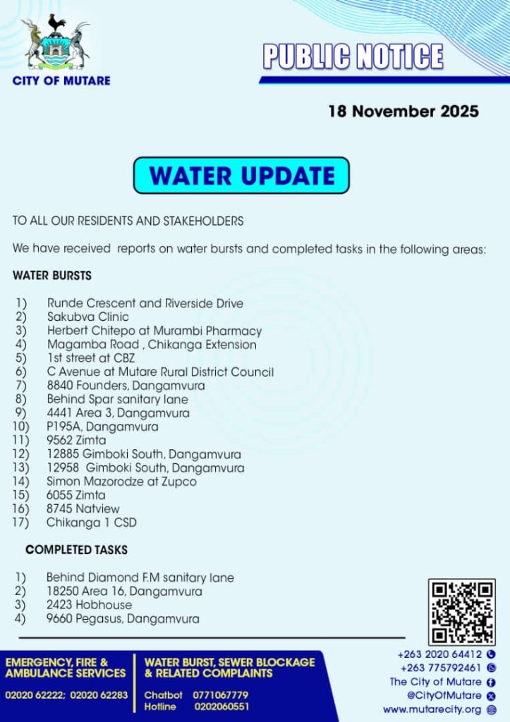 November 18, 2025 - In Daily Notices By Charles Sadondo Comment off Water update 18 November 2025 Previous Water update 14 November 2025 Next Refuse schedule 18 November 2025