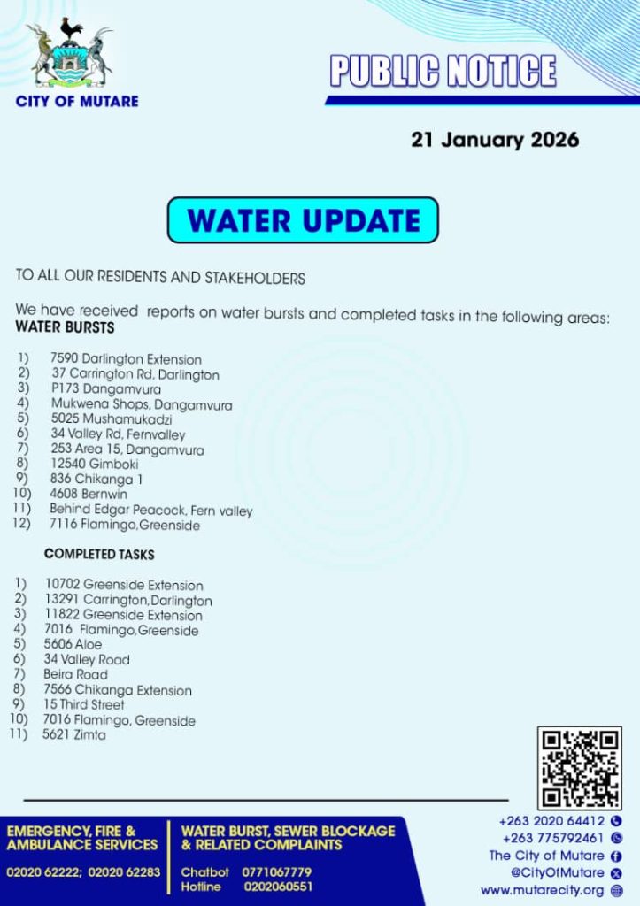 January 21, 2026 - In Daily Notices By Charles Sadondo Comment off Water update 21 January 2026 Previous Refuse schedule 21 January 2026 Next Refuse schedule 22 January 2026
