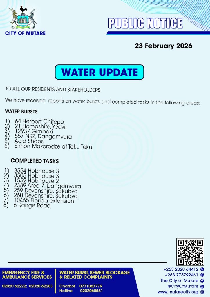 February 23, 2026 - In Daily Notices By Charles Sadondo Comment off Water update 23 February 2026 Previous Refuse schedule 23 February 2026