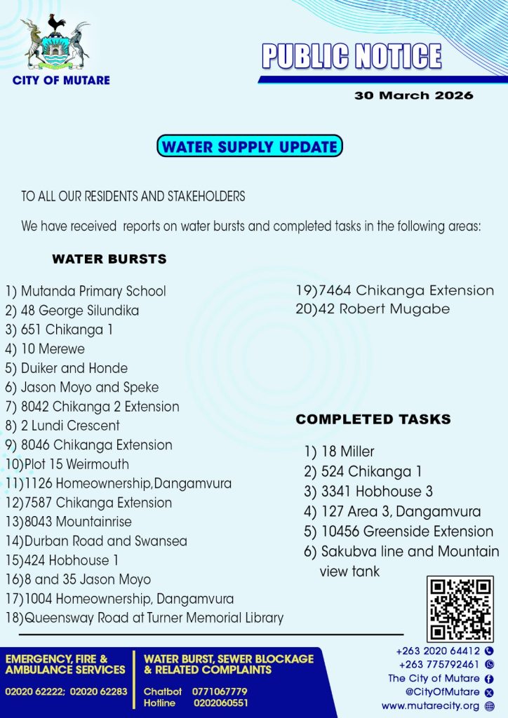 March 30, 2026 - In Daily Notices By Charles Sadondo Comment off Water update 30 March 2026 Previous Refuse schedule 30 March 2026 Next GIS WASTEWATER DATA COLLECTION EXERCISE