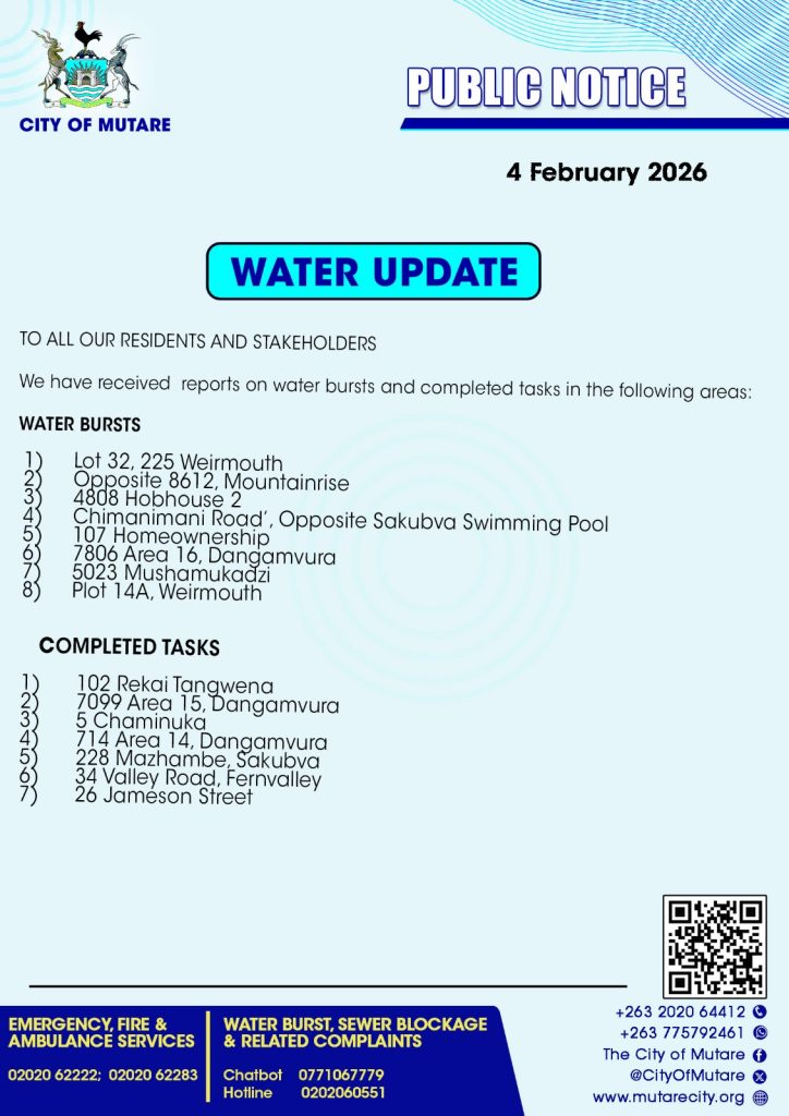 February 4, 2026 - In Daily Notices By Charles Sadondo Comment off Water update 4 January 2026 Previous Refuse schedule 4 February 2026 Next Refuse schedule 5 January 2026