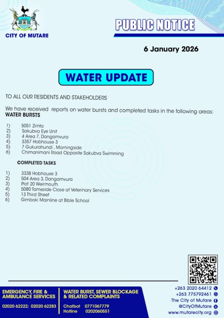 January 6, 2026 - In Daily Notices By Charles Sadondo Comment off Water update 6 January 2026 Previous Refuse collection 6 January 2026 Next Refuse schedule 7 January 2026
