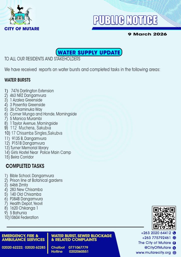 March 9, 2026 - In Daily Notices By Charles Sadondo Comment off Water update 9 March 2026 Previous Refuse schedule 3 March 2026